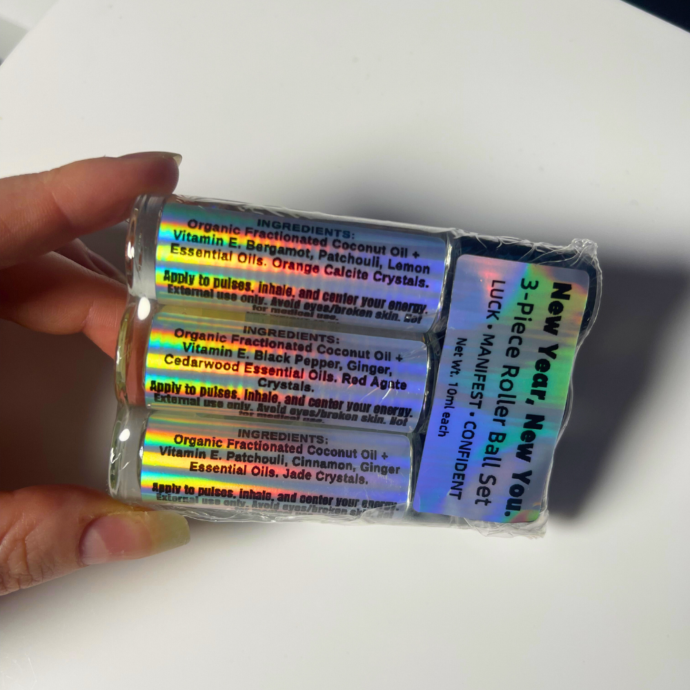 Each roller is made with organic fractionated coconut oil and infused with healing crystals, offering both aromatherapy benefits and energetic support. Finished with holographic labels that shift color depending on light and angle — making this set visually magical and gift-ready.